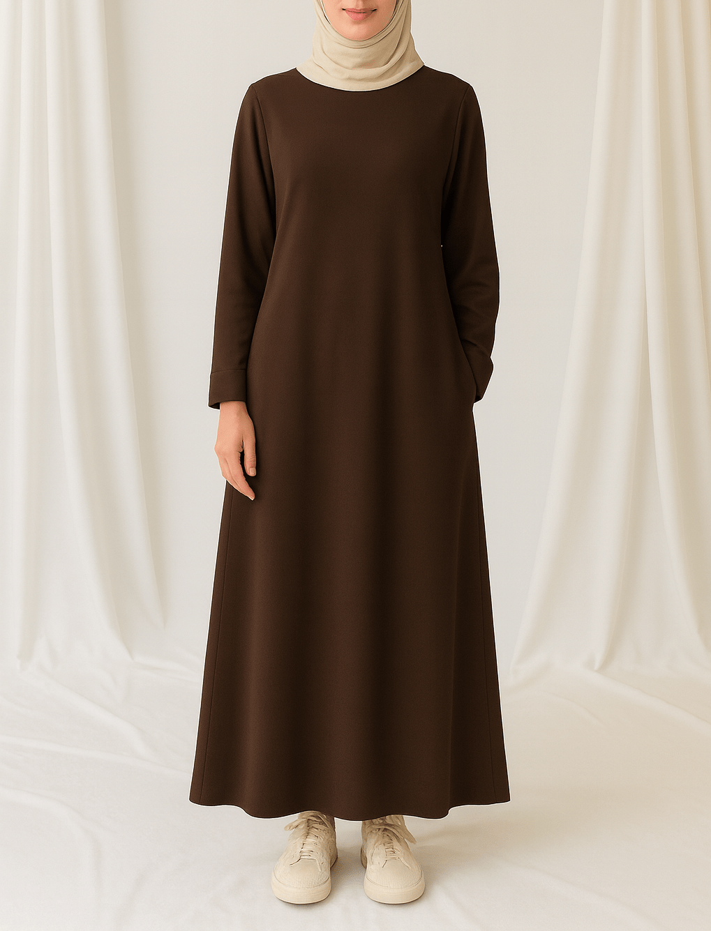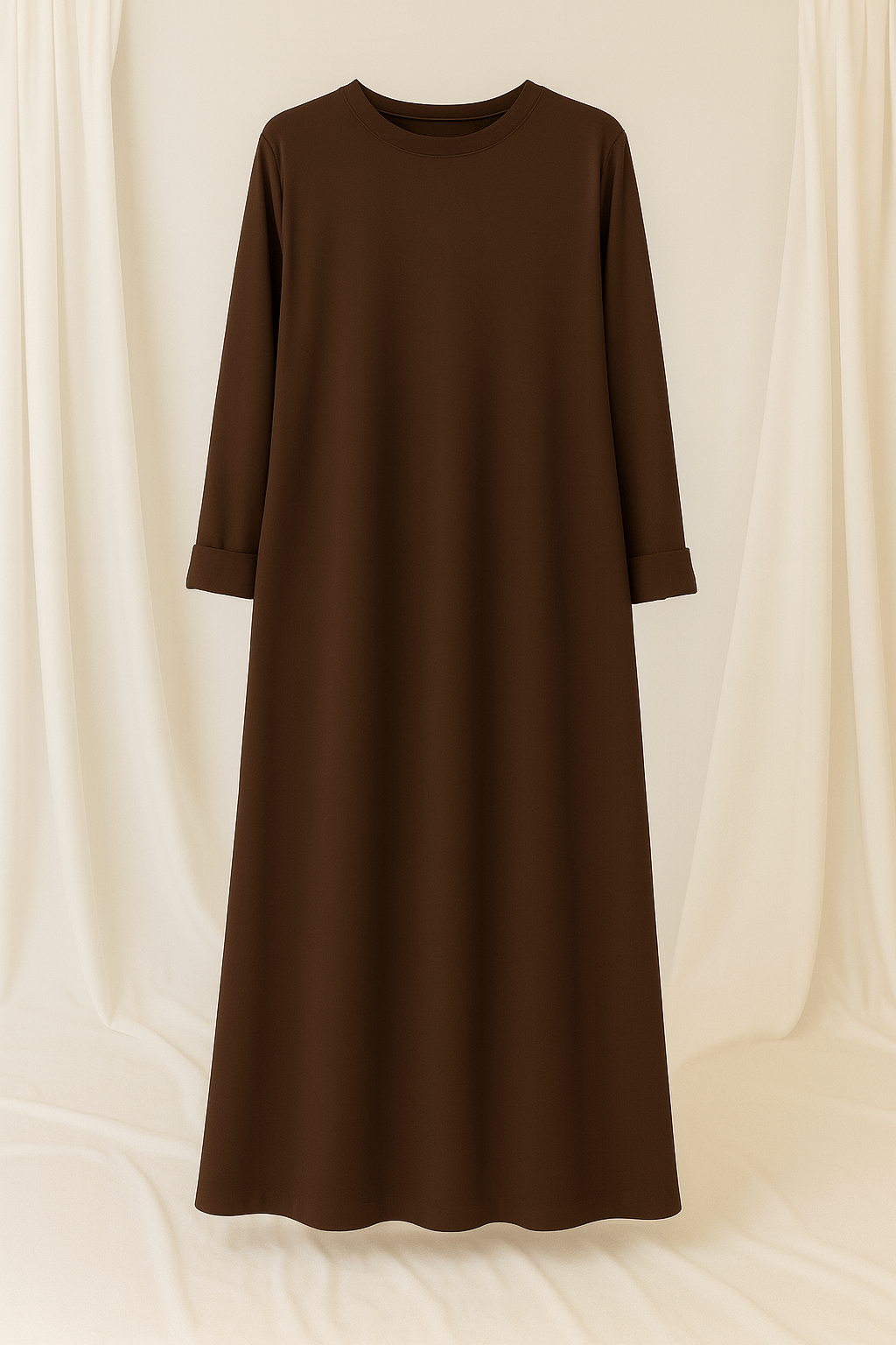 Deze elegante en ruimvallende donkerbruin abaya is vervaardigd uit 100% polyester, waardoor hij licht, soepel en uiterst comfortabel draagt. De stof is luchtig en ademend, ideaal voor warme zomerdagen, maar tegelijk dicht genoeg om ook in koudere seizoenen prettig te dragen. Dankzij de ruime pasvorm kun je er in de winter eenvoudig extra lagen onder dragen zonder dat het model zijn mooie vorm verliest.