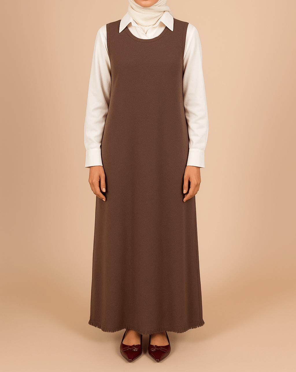 De jurk heeft een klassieke ronde halslijn en een rechte, iets losvallende pasvorm. Aan de onderzijde is de jurk afgewerkt met een subtiele fijne franjezoom, wat zorgt voor een moderne, verfijnde uitstraling. Het model is lengte-georiënteerd op midi, waardoor de jurk zowel casual als semi-formeel gedragen kan worden.